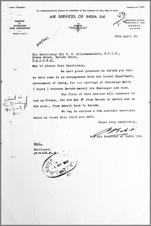 | Letter Announcing the Start of Air Mail Service from Baroda to Amreli | Letter Announcing the Start of Airmail Service Between Baroda and Amreli |